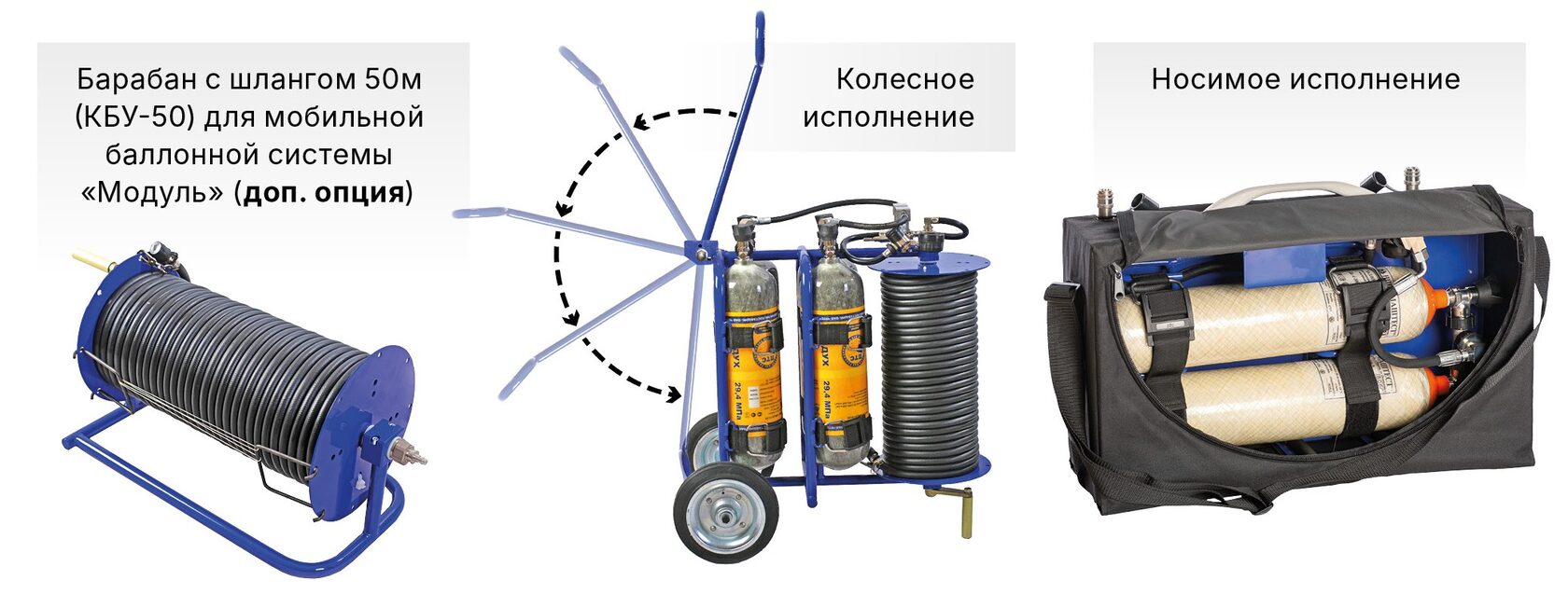 Система выпускается в колесном исполнении, в состав которого входят два или четыре баллона вместимостью 6,8 л, и в носимом исполнении с двумя баллонами вместимостью 4 л.