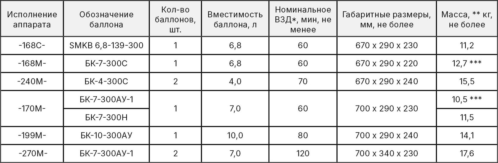 * – номинальное время защитного действия при легочной вентиляции 30 дм³/мин и температуре окружающей среды (25 ± 5) °С (фактическое время защитного действия зависит от степени тяжести выполняемой работы и условий окружающей среды); ** – масса снаряженного аппарата (без спасательного устройства, чехлов и др. вспомог. устр.). При комплектации штуцером quick fill масса аппарата увеличивается на 0,4 кг; *** – масса аппарата при комплектации базовой подвесной системой с пластиковыми пряжками. При комплектации аппарата комфортной подвесной системой масса увеличивается на 0,2 кг. При комплектации аппарата подвесной системой с металлическими пряжками масса увеличивается на 0,3 кг.